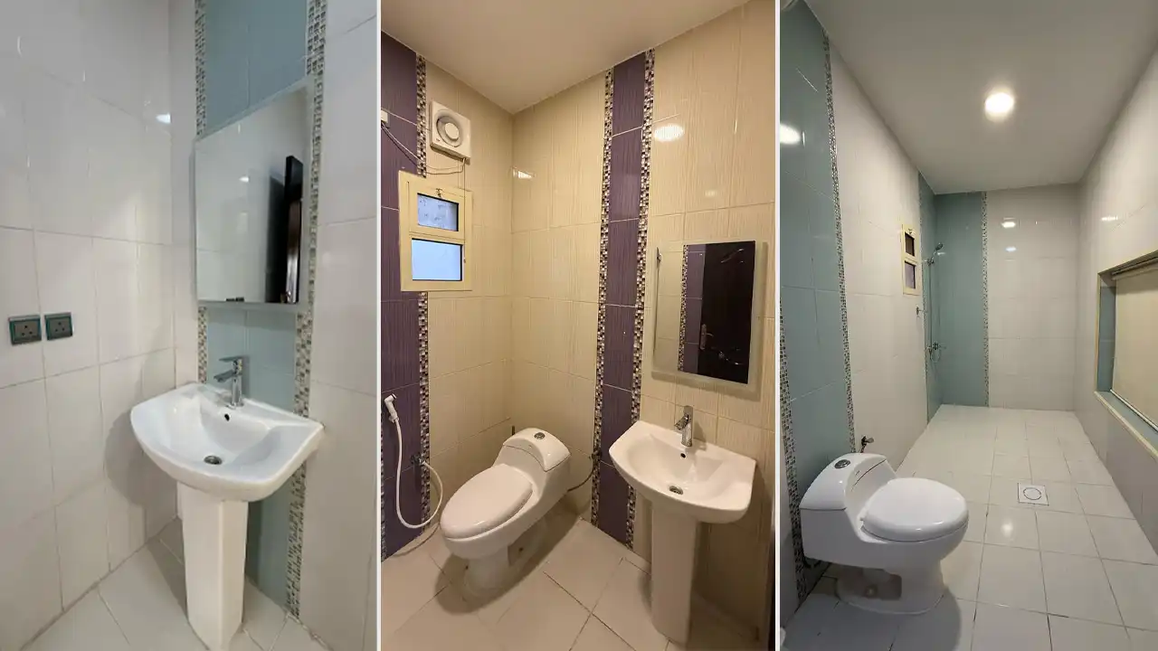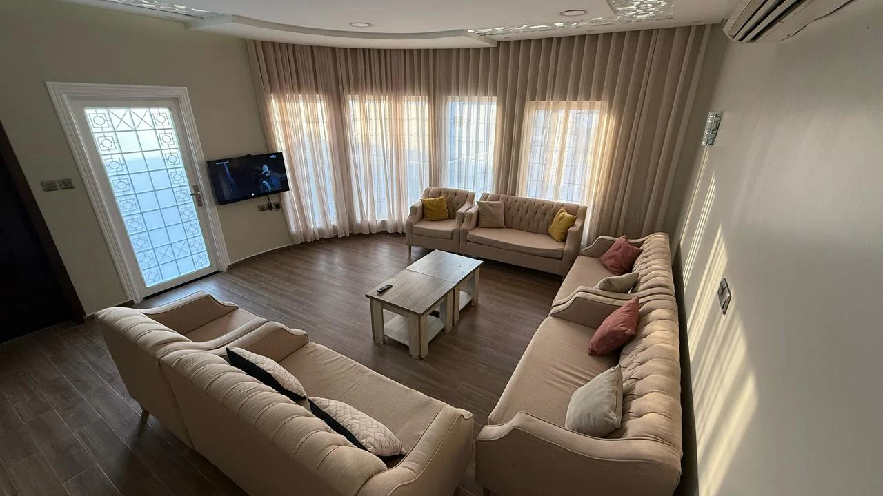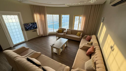 صالة جلوس بكنب تسع 10 أشخاص مع تلفزيون ذكي ودورة مياة