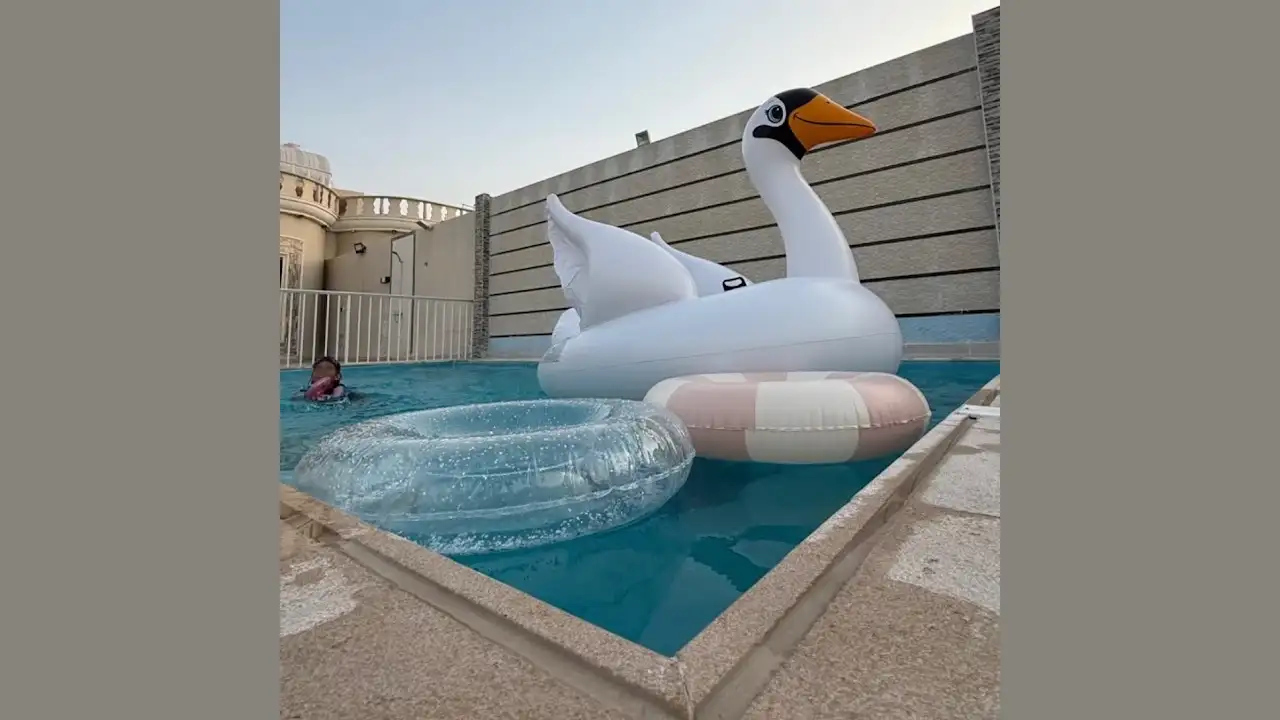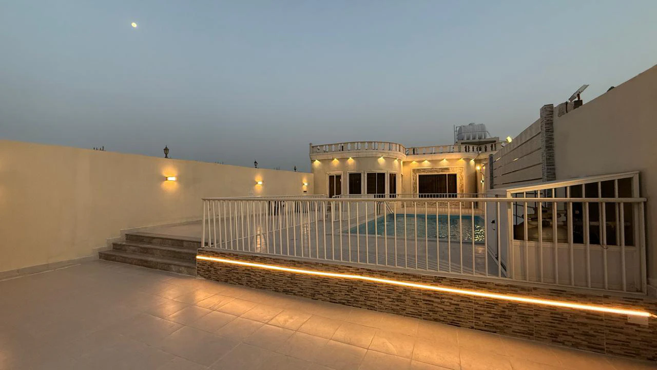 مسبح خارجي بحاجز (4×8 م) بعمق متدرّج من 120 إلى 170 سم