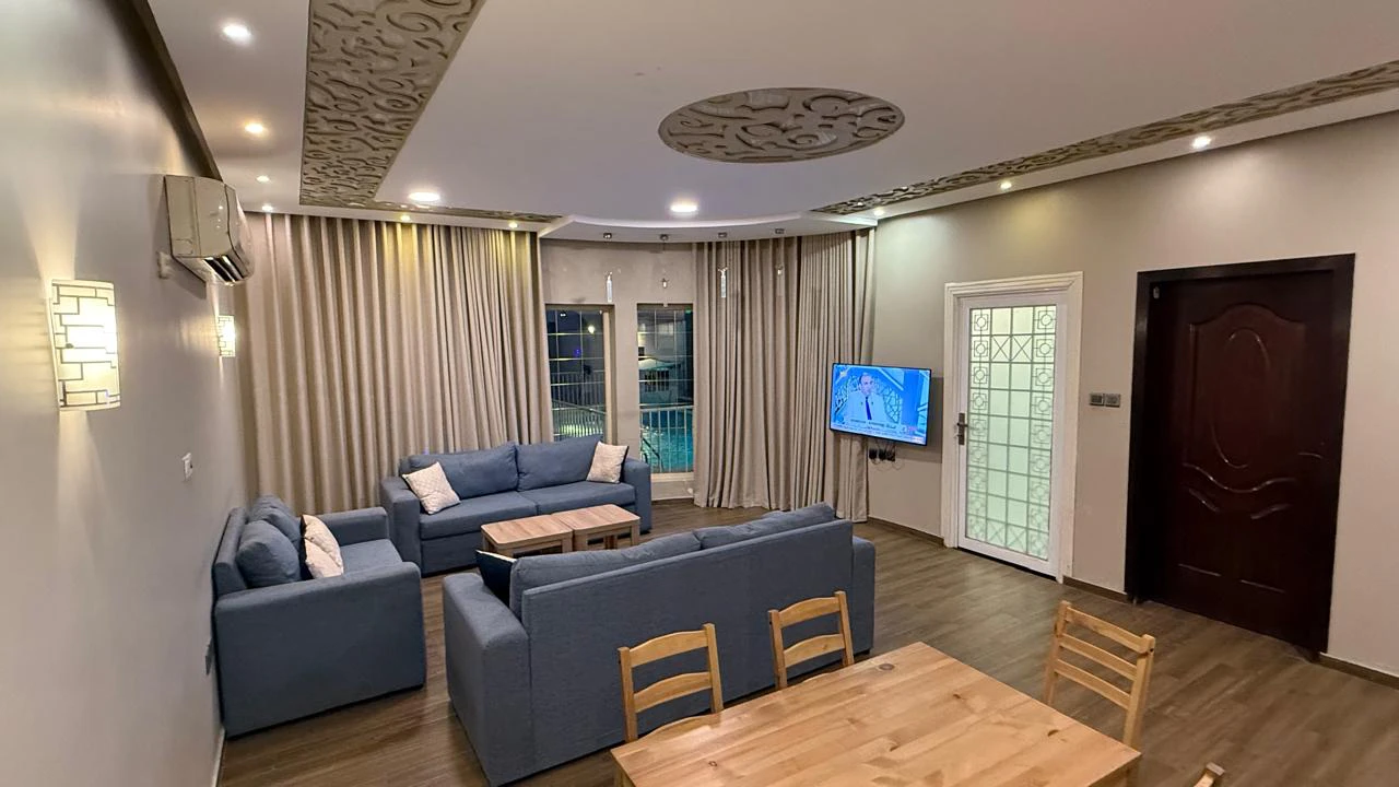 • صالة جلوس بكنب تسع 8 أشخاص مع تلفزيون ذكي ودورة مياة