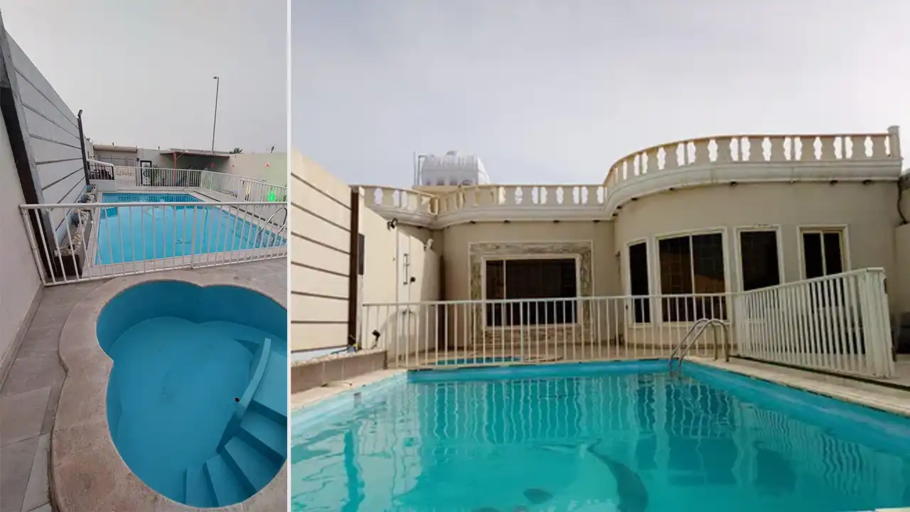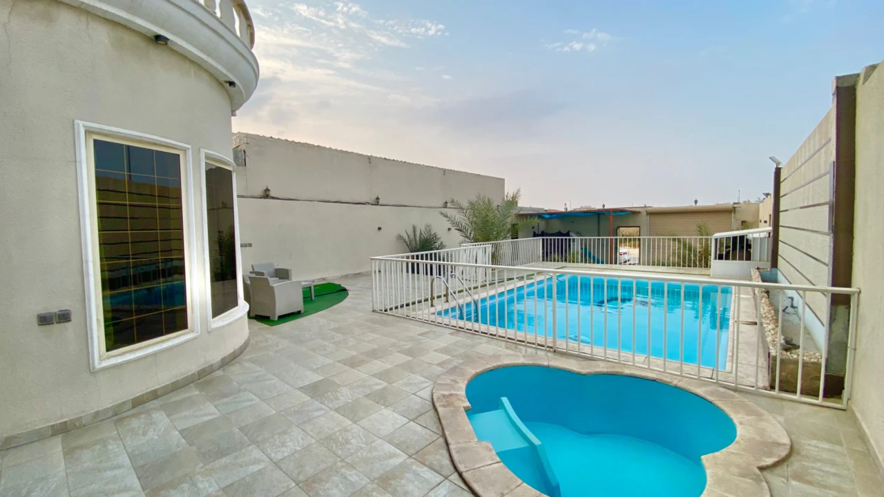 استراحة متكاملة بتصميم عصري، تضم مسبحًا خارجيًا بحاجز ومسبحًا للأطفال، وصالة جلوس مريحة بكنب وتلفزيون ذكي، وغرف نوم مجهزة بالكامل، ومطبخ تحضيري متكامل، بالإضافة إلى جلسة خارجية وفناء واسع مع ألعاب للأطفال، ومدخل خاص على الشارع وجراج أوتوماتيكي يتسع لسيارة واحدة. 🚗 ​